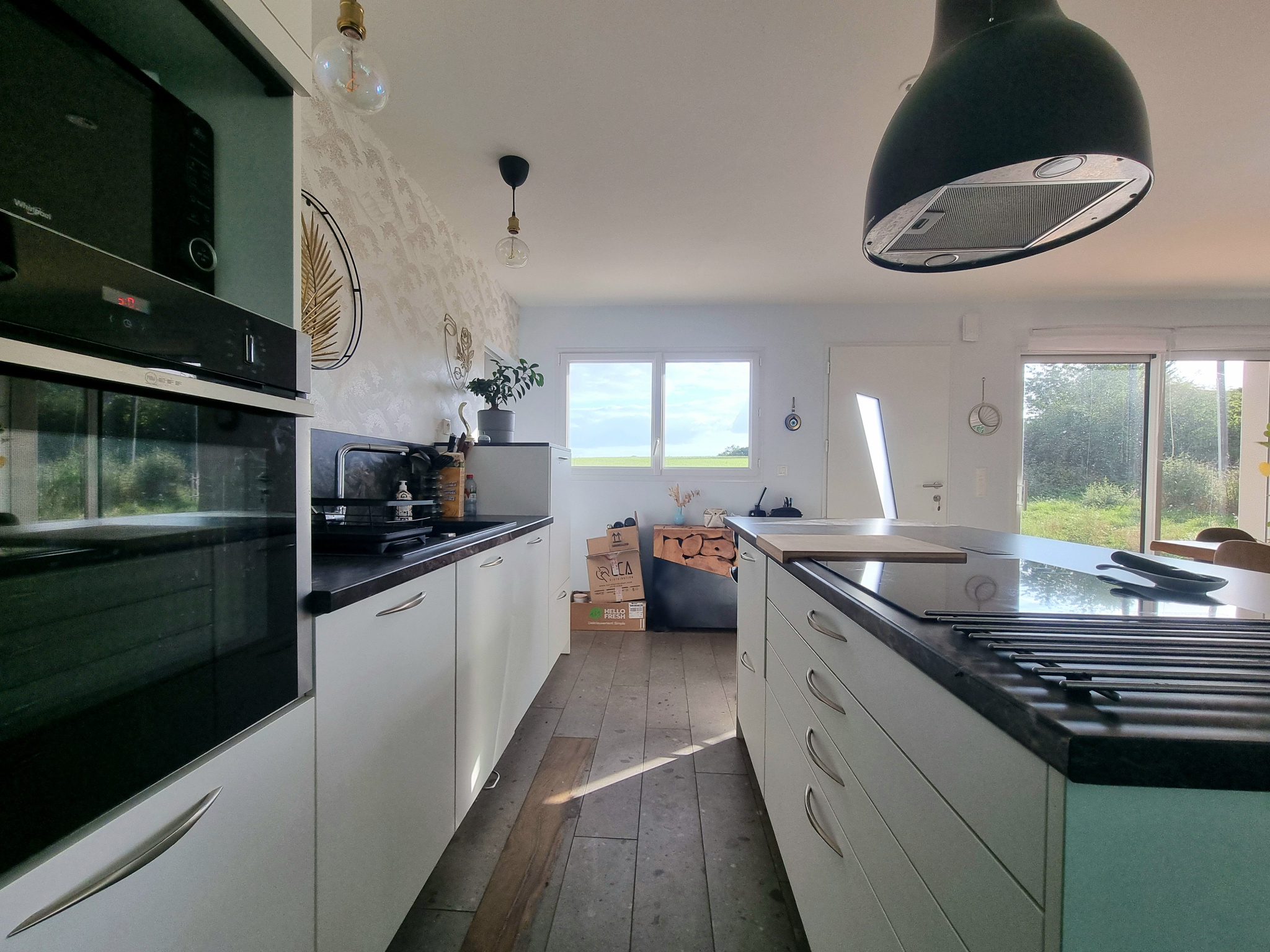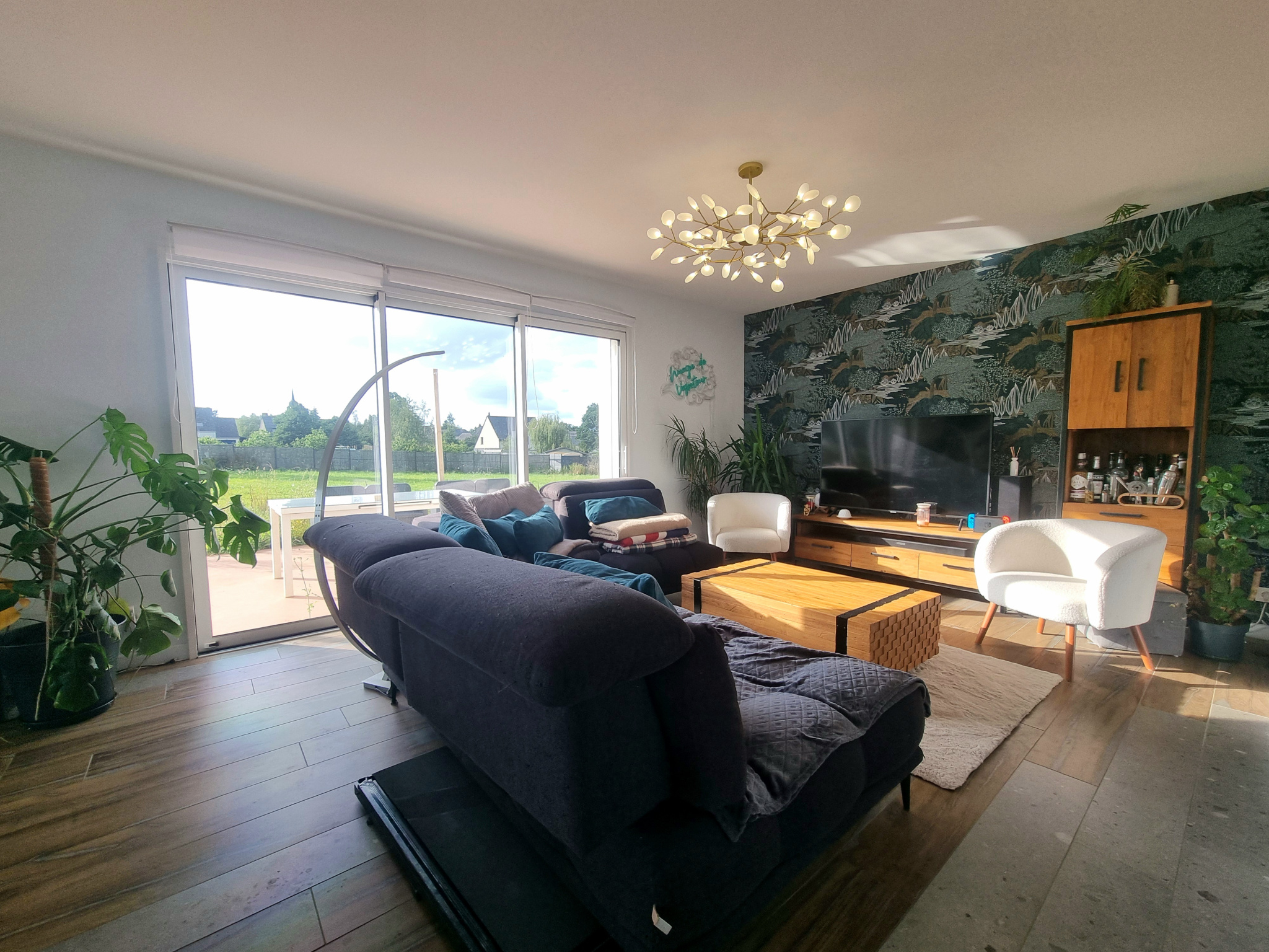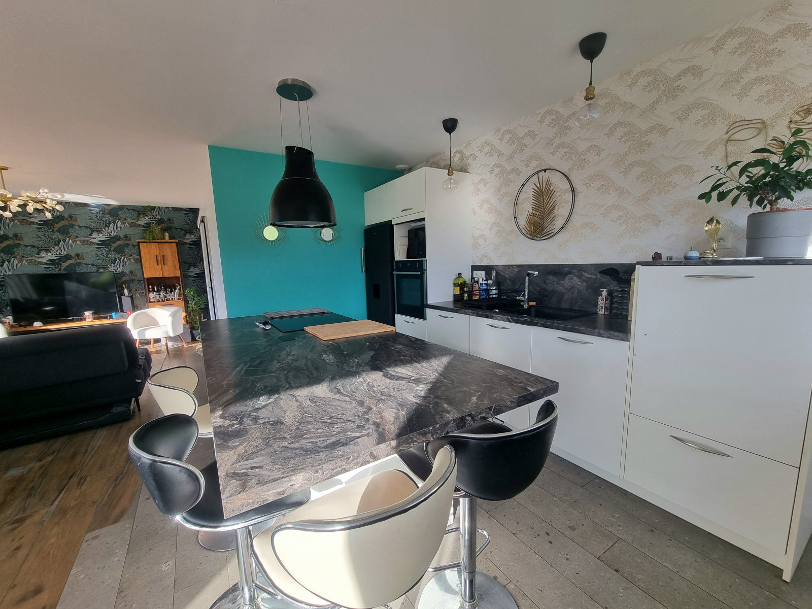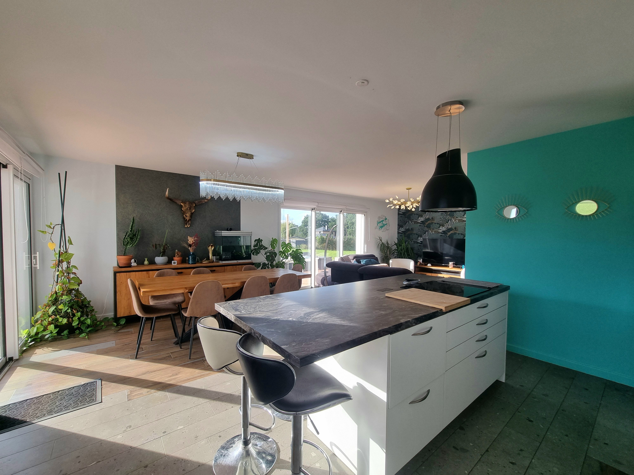Entrée sur pièce de vie d'environ 44 m² exposée Sud/Ouest avec sa cuisine aménagée équipée et son îlot central, accès à trois terrasses distinctes sur dalle béton pour une surface totale d'environ 110 m².