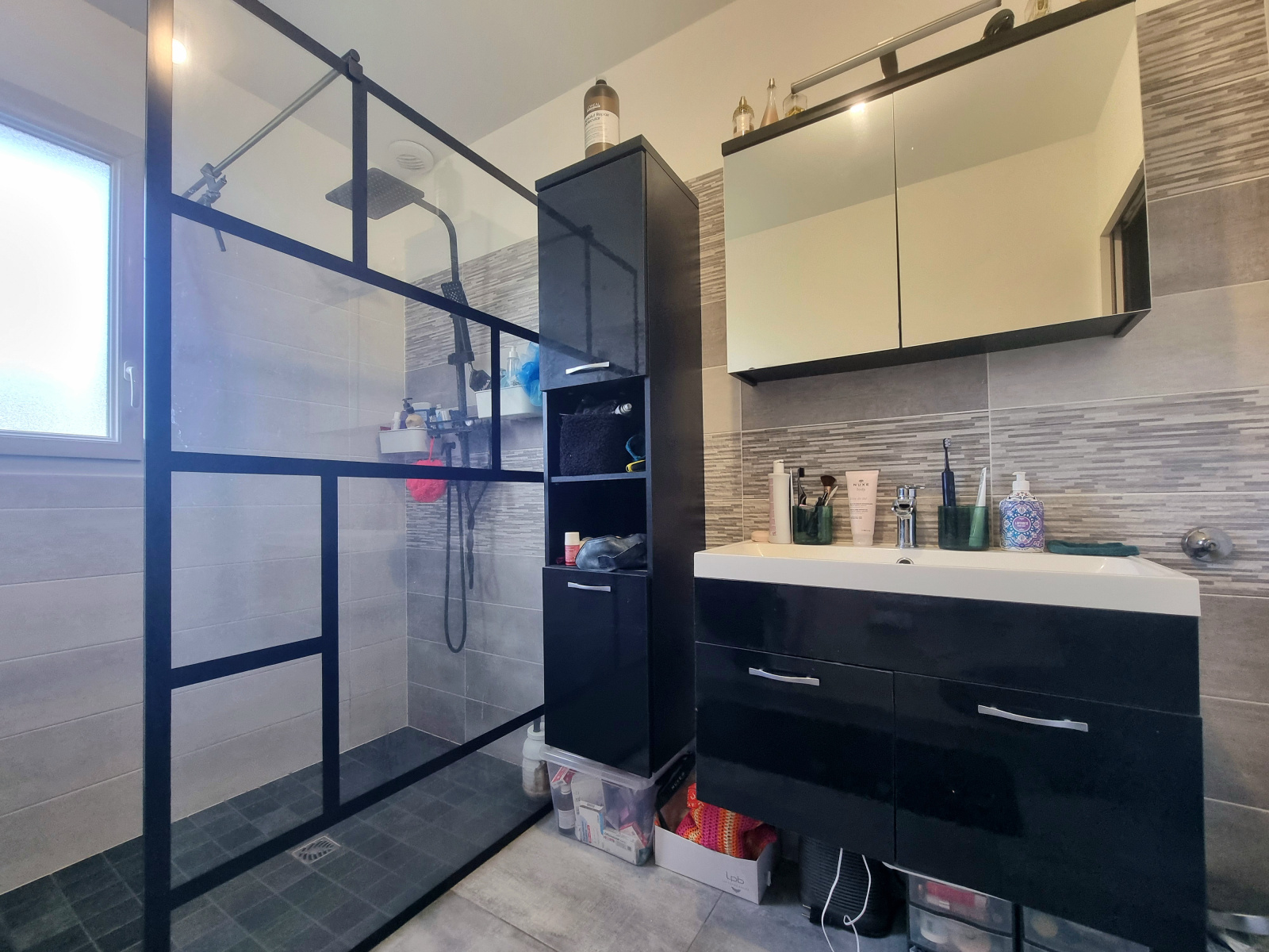 Cellier avec meuble simple vasque et rangements, accès terrasse Nord, garage attenant avec porte motorisée.