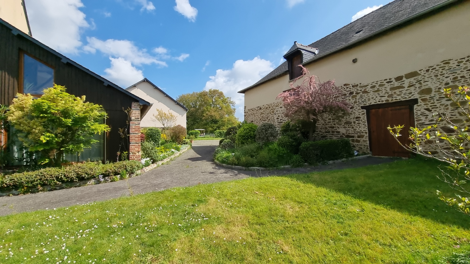Le bâtiment d'habitation profite d'une agréable terrasse sans vis à vis, d'aménagements extérieurs et d'une vue sur la campagne environnante.